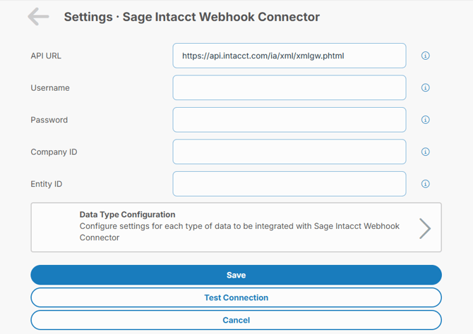 Example image showing an unconfigured Sage Intacct Connector utilizing Webhooks