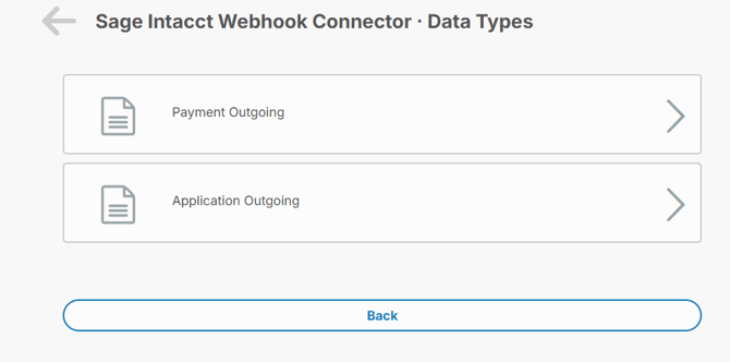 The data types will control how frequently the specific data type will run and also provide information on when the last run occurred. Using the above screenshot for reference, the Webhook connector data types will control how often Payment & Applications will be sent from PayFabric Receivables to Sage Intacct.