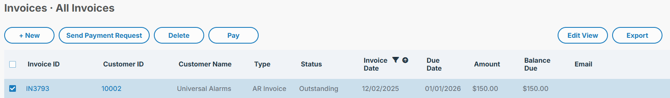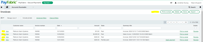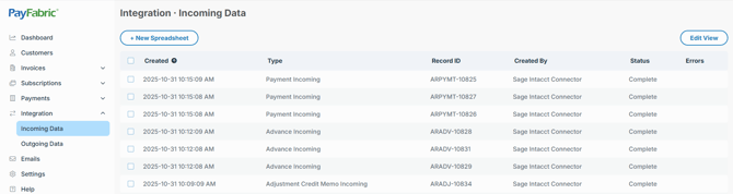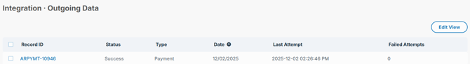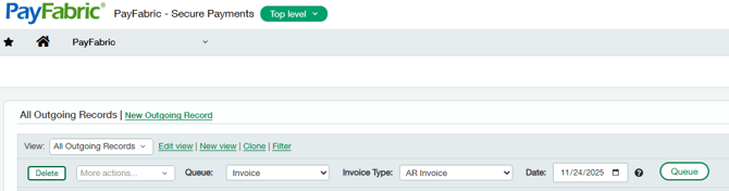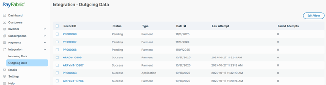 PayFabric outgoing records page will display the list of records that will/have been integrated into PayFabric Receivables.