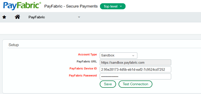 | PayFabric Password | Set this value to the password associated to the PayFabric Device ID for Sage Intacct. |