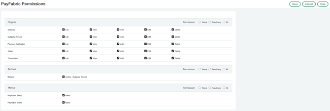 Example image depicting the available PayFabric permissions which can be configured.